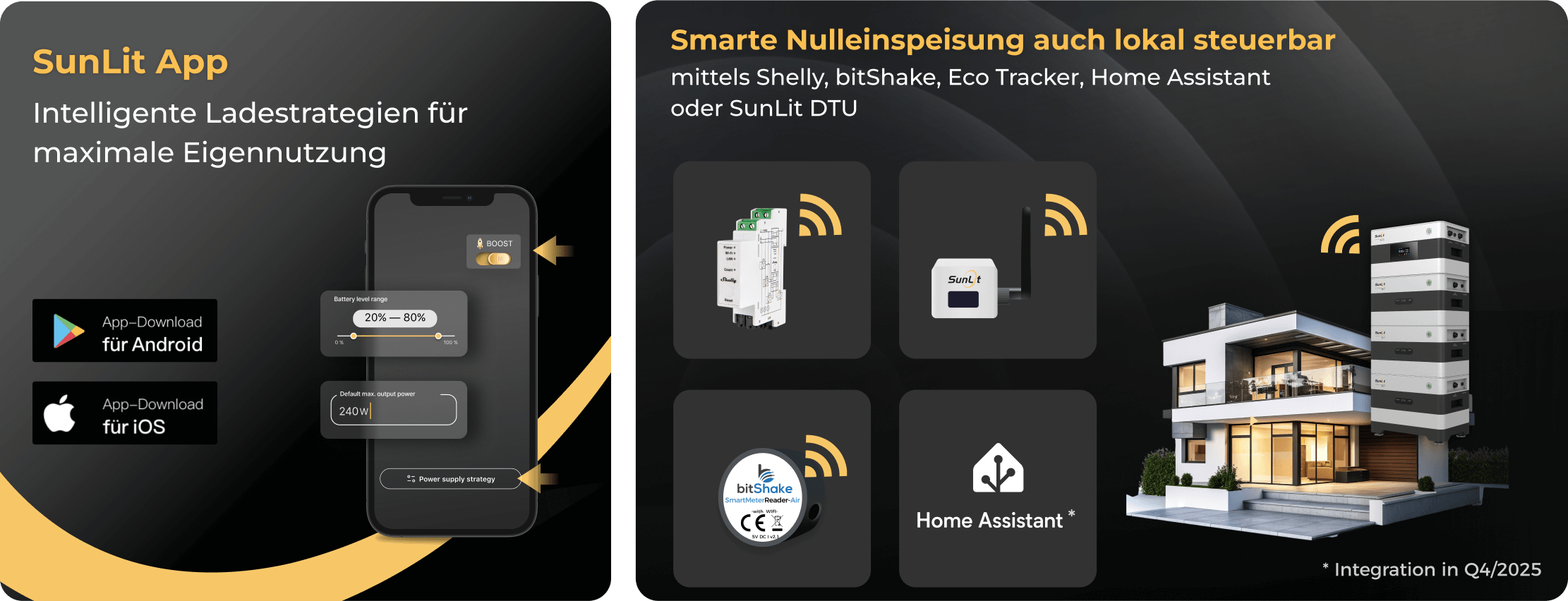 Echtzeit-Überwachung, Kontrolle und Optimierung der Einspeisung durch SunLit Solar App mit Tag- und Nachteinspeisung