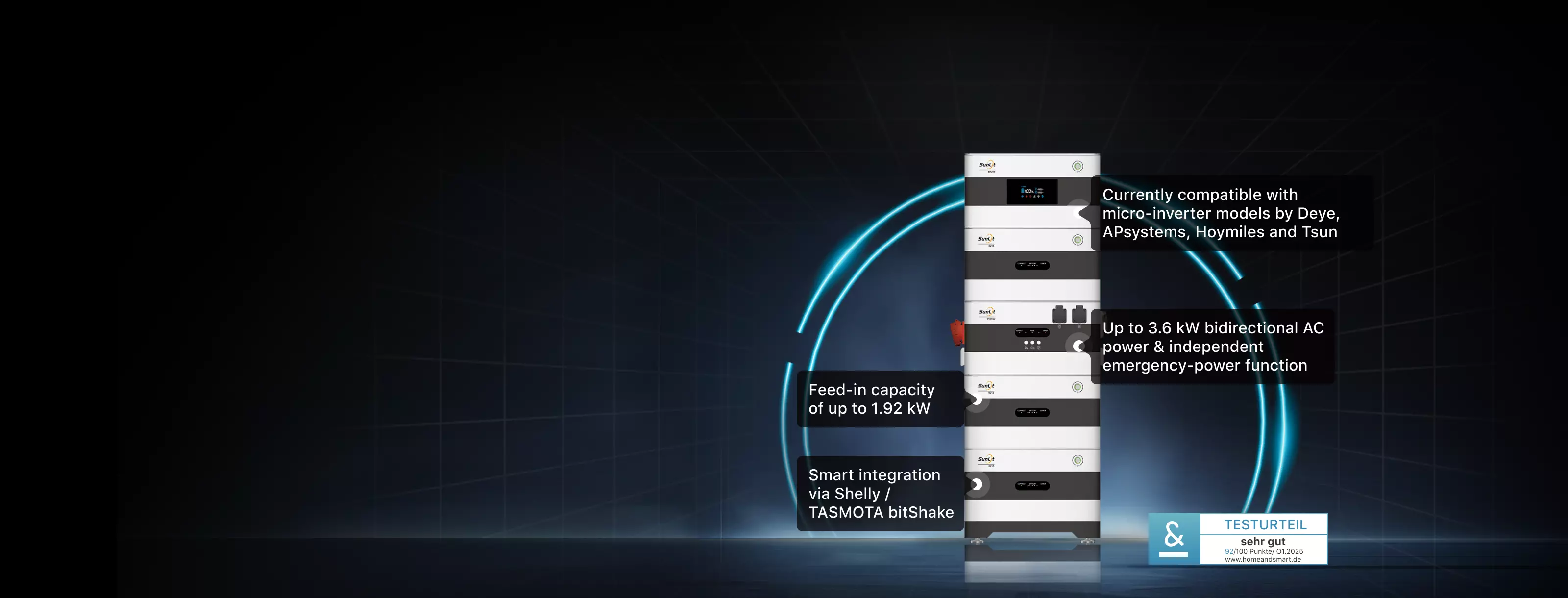 High-quality head storage with 2.15 kWh storage capacity, 2x outputs with up to 1,920 W max and 2x PV inputs up to 1,600 W for up to 4 solar modules (up to 400 W each)