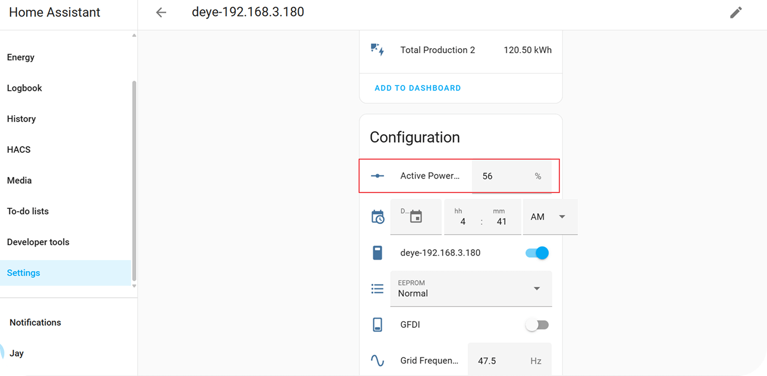 - Select your Deye inverter device and view the current maximum output power percentage.