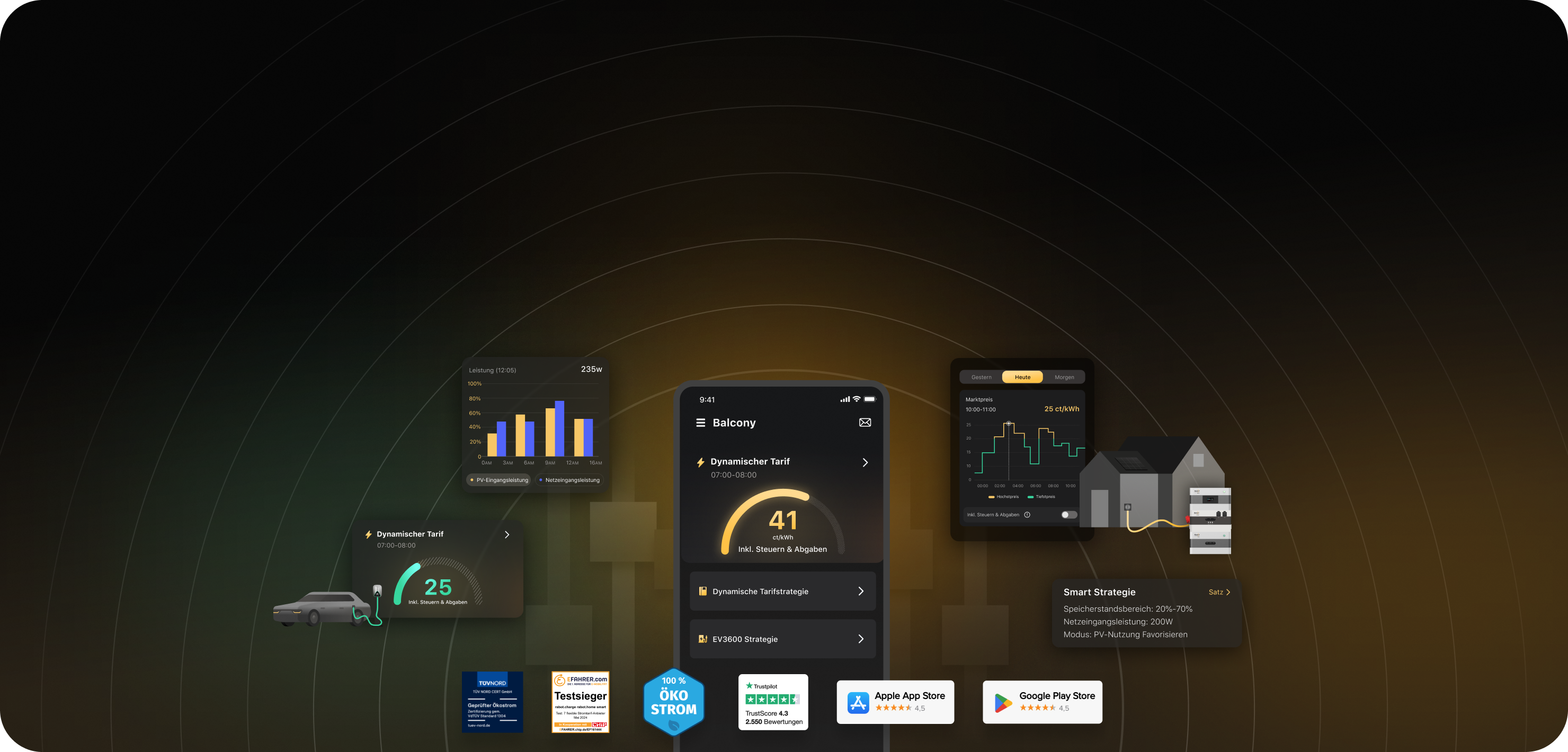 Nutze Echtzeit-Strompreise, um Deine Energiekosten maximal zu optimieren und bis zu 40% zu sparen. Unsere nahtlose Integration in das App-System macht das Energiemanagement kinderleicht, während erneuerbare Energiequellen Deine Stromversorgung nachhaltig und intelligent gestalten. Übernimm die Kontrolle über Deinen Energieverbrauch mit flexiblen Verbrauchsstrategien, die an die dynamischen Preise angepasst sind.